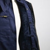 生地はネイビーブルーのコットンポリエステル素材を使用。強度的に申し分なく、ライナーを外せば家庭洗濯も可能なのでラフに着込んで頂けます。