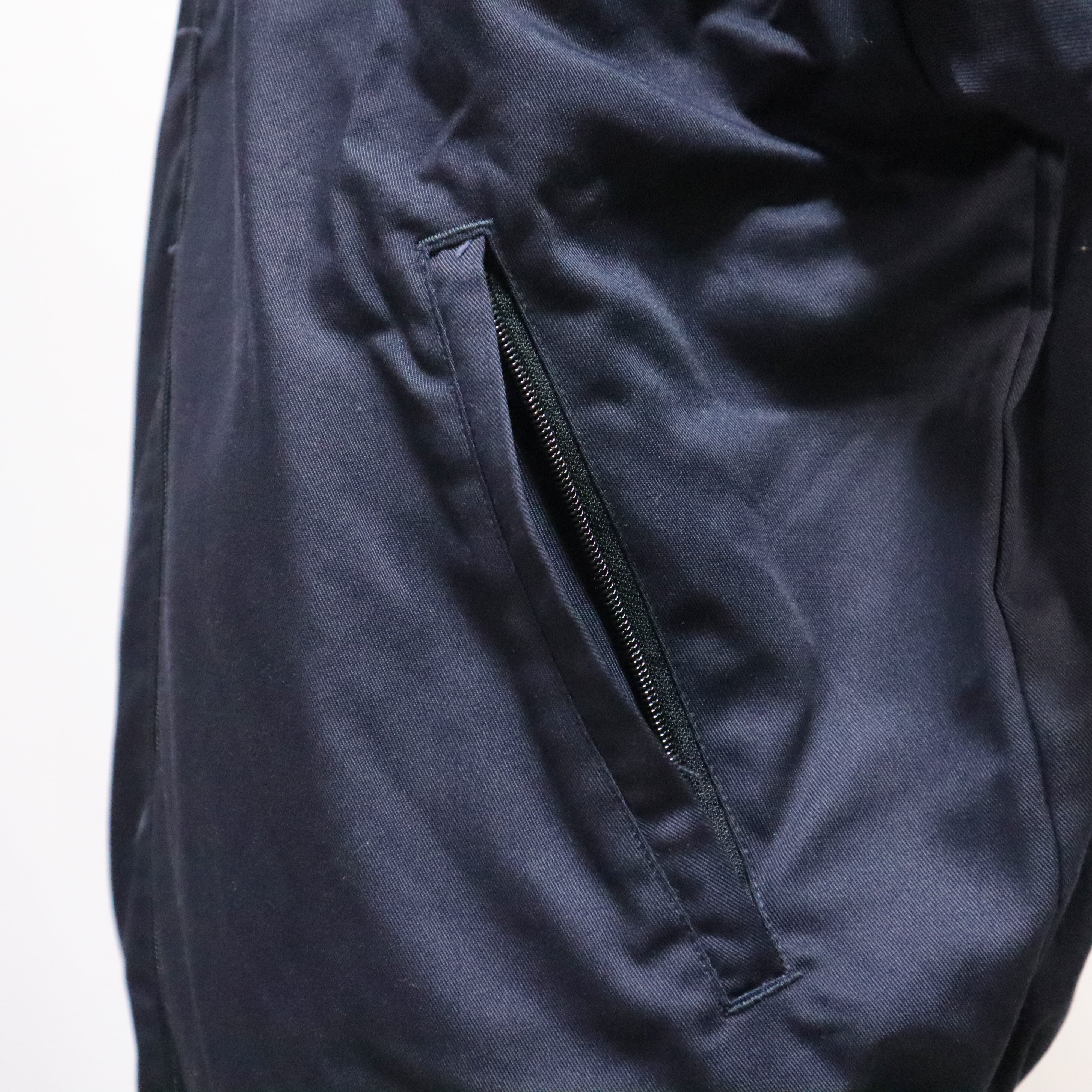 表地はソリッドなネイビーのポリエステル×コットンのツイル生地、裏地に薄手のコットン天竺を使用。
